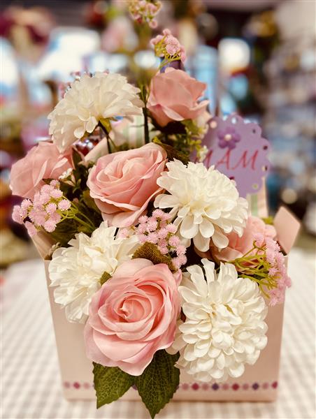 A novelty design of artificial forever flowers arranged in an envelope design box, with nanna, mam or mum pick as required.