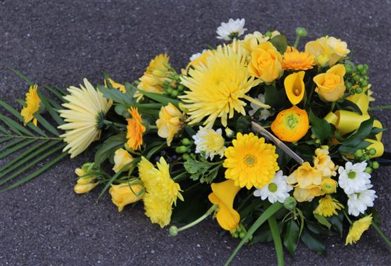 A single ended spray in foam, using Irish colours. Flowers may vary due to seasonal availability. Approx 24" long.