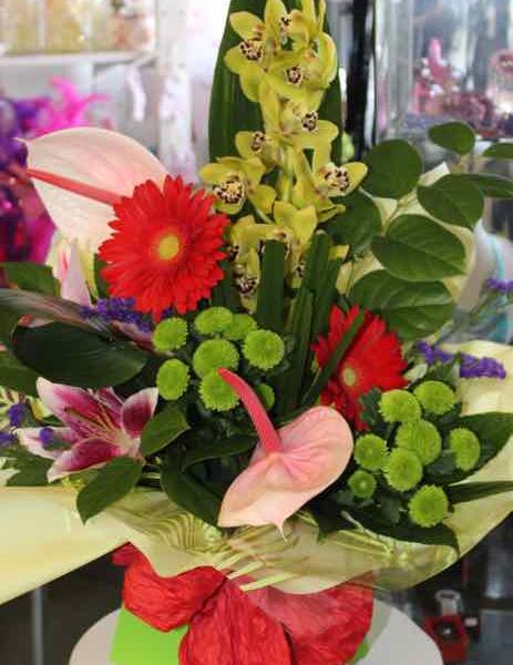 A mixture of tropical flowers and foliages arranged in a box and finished with a bow. Including orchids, and lilies. Colours may vary depending on availability.